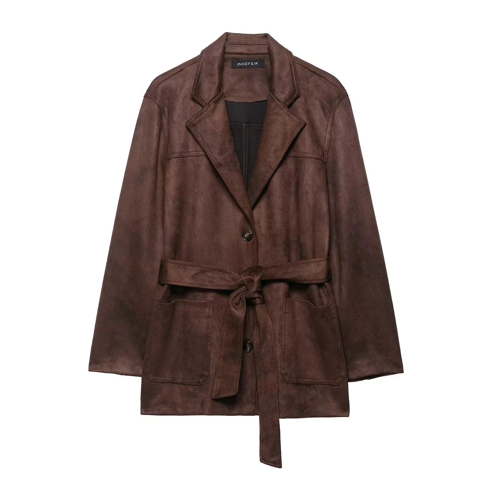 Details: Waist Belt, Front Pockets, Button Closure, Lapel Collar